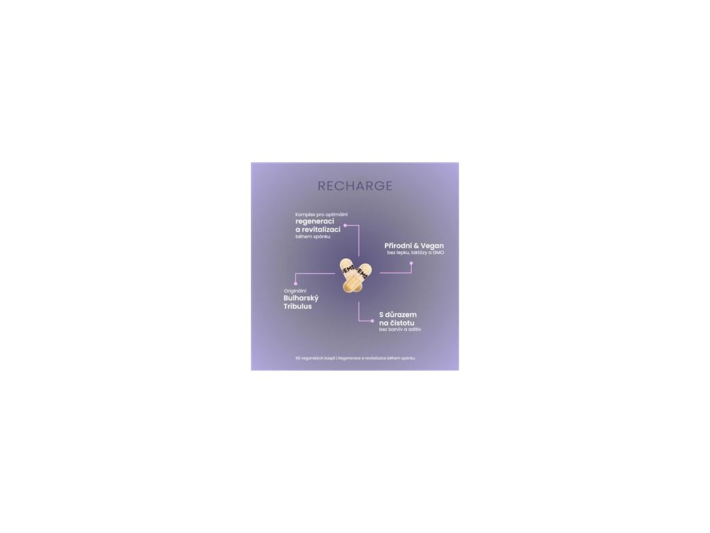 Recharge je komplex šesti účinných složek určených pro podporu kvalitního spánku a regenerace - při nadměrném fyzickém, sexuálním a psychickém zatížení. Pravidelná suplementace přináší pozitivní výsledky pro optimalizaci spánkového režimu, pro podporu proteosyntézy během spánku, pro harmonizaci nervového systému a pro navýšení tréninkových výsledků a výkonu. Při pravidelném tréninku, fyzické a psychické námaze, může docházet k problémům se spánkem, díky vybuzení organismu a následnému nadměrnému vyčerpání. Zhoršená