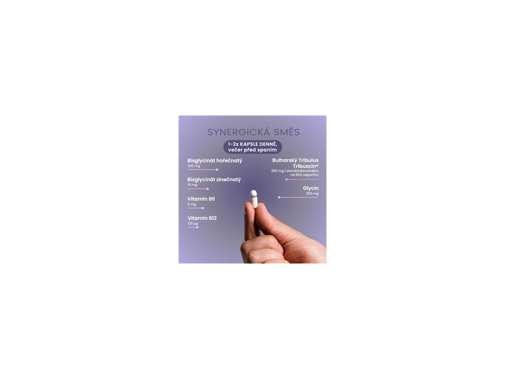 250 mg (standardizováno na obsah 60% furostanolového saponinu, determinovaného jako protodioscin), bisglycinát hořečnatý 230 mg (poskytuje 46 mg hořčíku tj. 12,6 % RHP*), vitamín B6 5 mg (pyridoxin-hydrochlorid), bisglycinát zinečnatý 15 mg (poskytuje 3 mg zinku tj. 30 % RHP*), koenzym B12 (kobalamin) 125 µg, obal kapsle (hydroxypropyl-methylcelulóza, barvivo