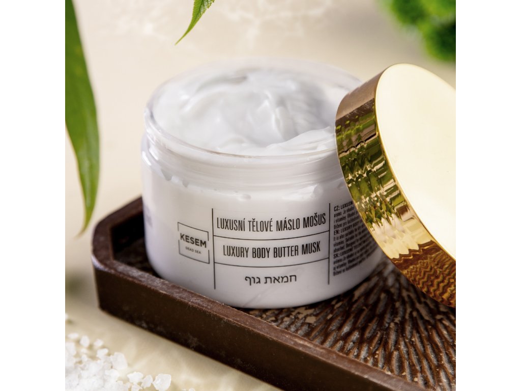 Dodání 3-4 pracovní dny. Luxusní tělové máslo mošus KESEM s minerály z Mrtvého moře důkladně vyživuje a hydratuje pokožku do hloubky. Regeneruje suché části kůže, zjemňuje a zanechává příjemný pocit na těle s okouzlujícím a jemným aroma mošusu. Obsahuje vodu a minerály z Mrtvého moře, bambucké máslo, výtažky z Aloe vera, přírodní oleje a vitamíny E a B5. Zklidňuje unavenou a podrážděnou pokožku, rychle se vstřebává, je vhodné pro citlivou i problematickou pokožku a je vhodné i pro děti. Bez parabenů a ropných derivátů.