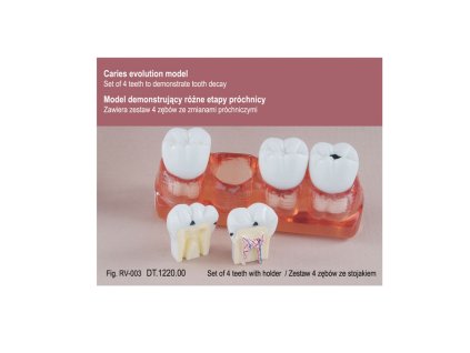 Sada Real Series je ideálním nástrojem pro zubní lékaře, hygienistky a studenty stomatologie. Modely realisticky zobrazují jednotlivé etapy vývoje zubního kazu – od počáteční demineralizace až po pokročilou destrukci korunky a postižení dřeně....