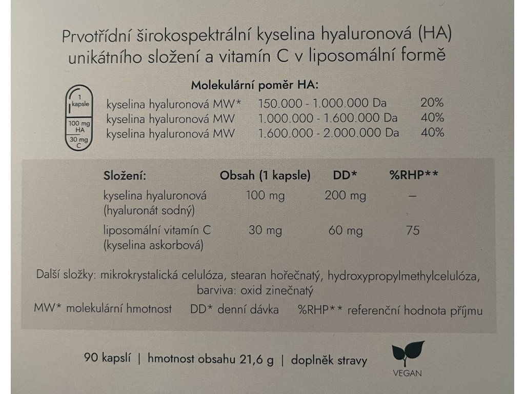 Každá kapsle Intelligent HA obsahuje 100 mg kyseliny hyaluronové a 30 mg vitamínu C v liposomální formě, která zajišťuje lepší vstřebávání a vyšší biologickou dostupnost.