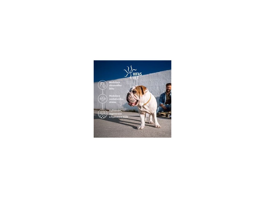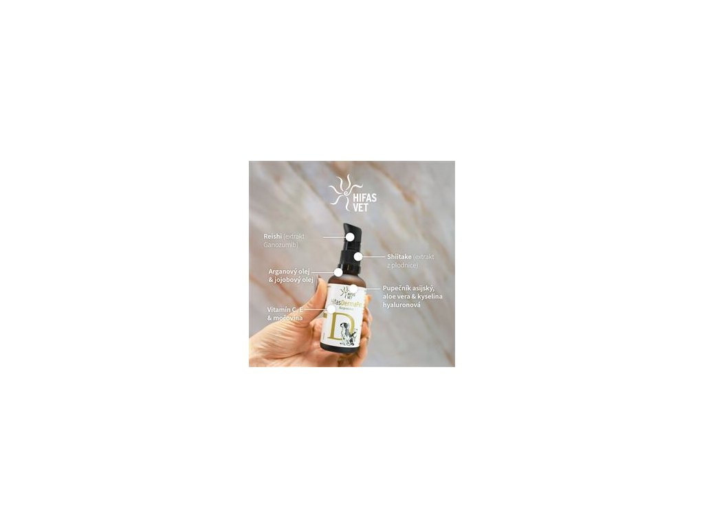 Hifas Derma Pet je tišící a regenerační krém pro psy a kočky s obsahem bioaktivních látek z adaptogenních hub a dalších složek zaměřených na oblast podrážděné kůže. Hodí se pro všechna plemena psů i koček jakéhokoli stáří. Lehce se nanáší na postižená místa. Adaptogenní houby hrají důležitou roli v modulaci oxidativního stresu a v modulaci odpovědi obranného štítu v případě problémů s pokožkou a kůží. Spolu s doplňujícími složkami (pupečník asijský, aloe vera, kyselina hyaluronová, vitamín C, E, močovina) kůži zvlhčují, vyživují do hloubky, dodávají potřebné živiny a napomáhají regeneraci. |