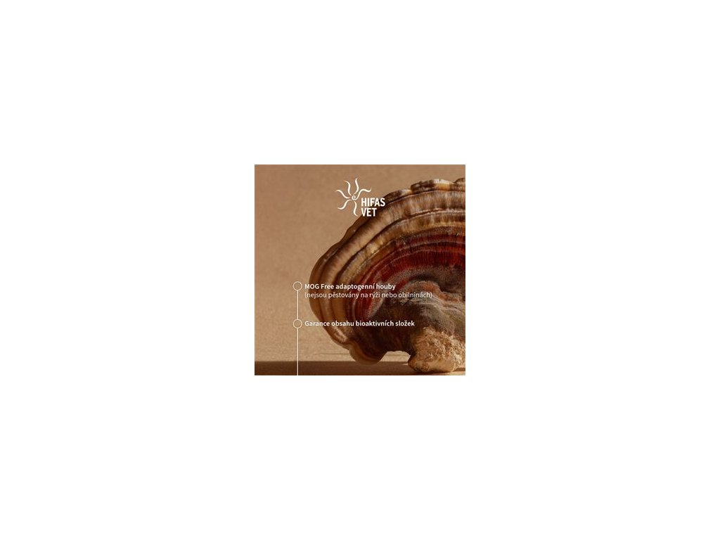 Reishi (Ganoderma lucidum), neboli "houba věčného mládí" Ganoderma lucidum je jednou z nejznámějších adaptogenních hub. Její přínosy jsou dány přítomností aktivních biomolekul nebo specifických živin – především polysacharidů, jako jsou beta-glukany (zejména β-D-glukany), terpenů (hlavně triterpenů) a peptidoglykany. Obsahuje stovky bioaktivních složek, které jsou zkoumány pro svůj významný vliv na kognitivní oblast, endokrinně-metabolický systém (včetně jaterních buněk), obranný štít a jako podpůrný prostředek ke zlepšení kvality života lidí i zvířat. |