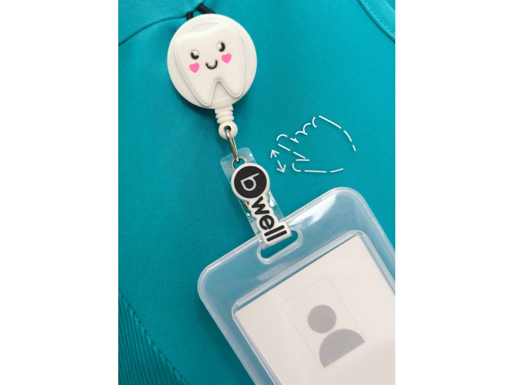 Samonavíjecí ID visačka na kartu ZUB značky B-Well je praktický doplněk k pracovní uniformě, který umožňuje snadné připnutí k oděvu bez omezení pohybu. Díky samonavíjecímu rolleru z PVC zůstává ID karta vždy po ruce a zároveň nepřekáží při práci. Vtipný motiv ve tvaru zubu zpříjemní prostředí pro pacienty a přidá osobní prvek vaší profesní výbavě.