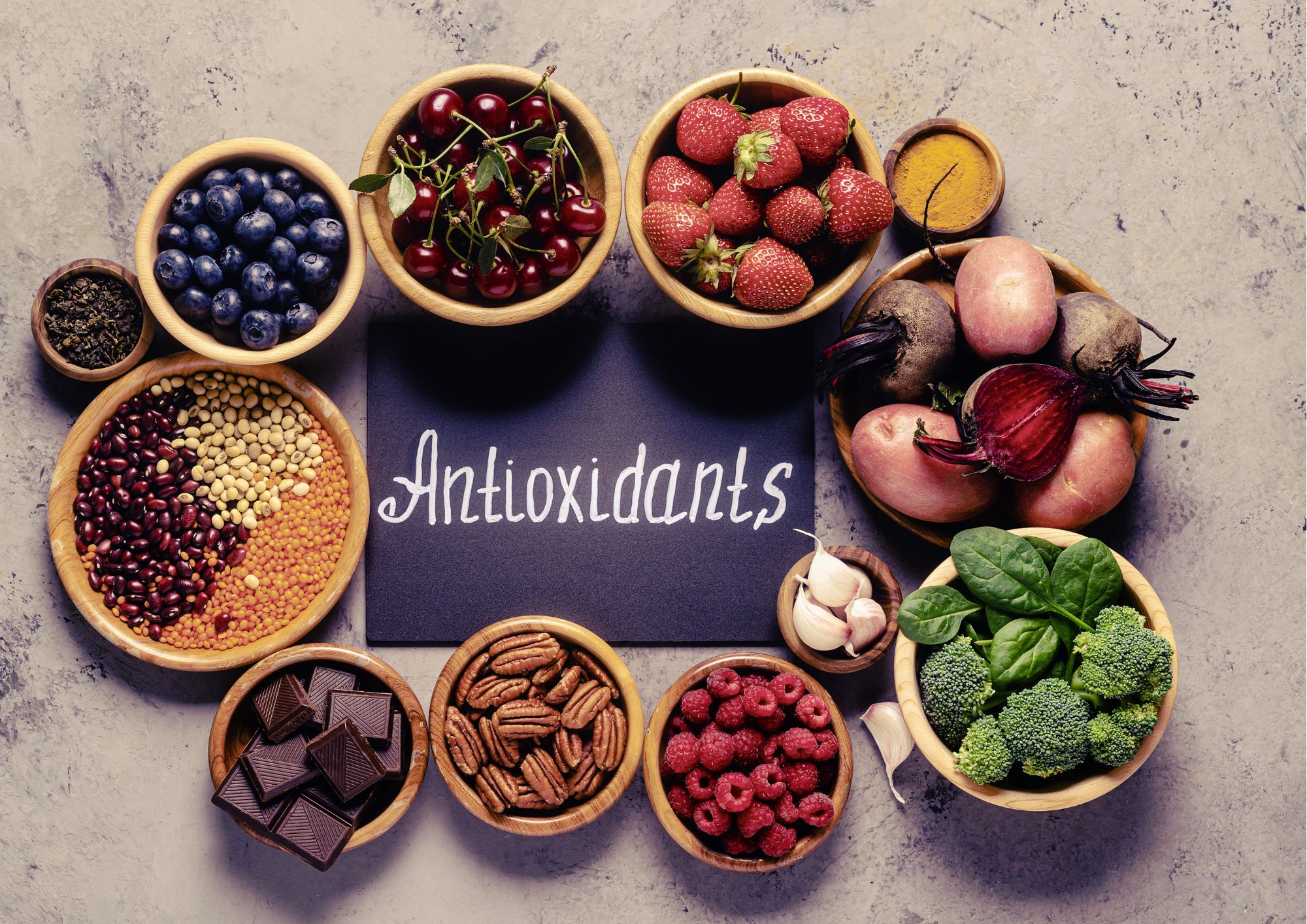 Strava poskytuje širokou škálu antioxidantů. Vitamin C je silný vodou rozpustný antioxidant, který chrání tekutiny v těle a pomáhá regenerovat vitamin E. Vitamin E je tukově rozpustný a chrání buněčné membrány před oxidací lipidů. Beta-karoten a další karotenoidy dávají ovoci a zelenině oranžovou, červenou a žlutou barvu a chrání především kůži a oči. Selen je minerál, který funguje jako kofaktor antioxidantních enzymů. Flavonoidy, polyfenoly a další rostlinné látky z ovoce, zeleniny, čaje a koření mají silné antioxidantní a protizánětlivé účinky.