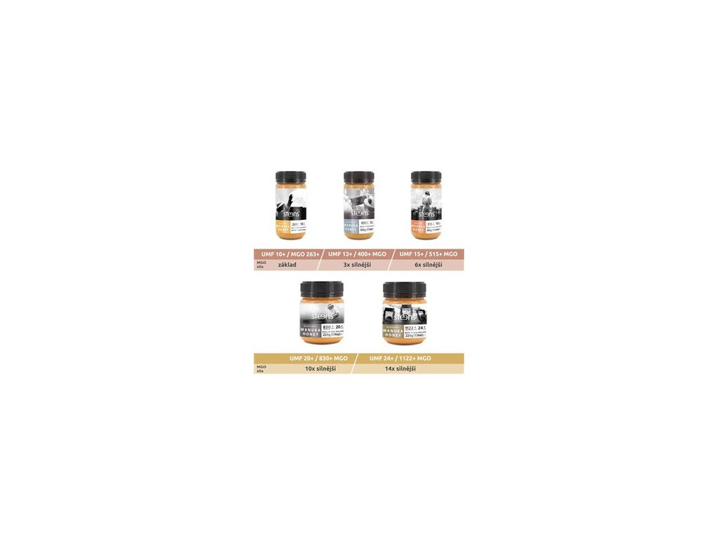 Steens Manuka Honey je raw nepasterizovaný pravý manukový med z Nového Zélandu. Pochází od včel opylujících Balmín metlatý, keř s bílorůžovými květy pocházející původně z Austrálie a Zélandu, kde mu původní domorodé maorské kmeny daly název Manuka. Med z květů Manuky má výjimečný výživový profil - obsahuje celé spektrum enzymů, aminokyselin, antioxidantů, vitamínů, minerálů a dalších látek s velmi zajímavými vlastnostmi. Manukový med je také známý jako chuťově výraznější, bohatší a plnější než jiné medy. Je to dáno velmi vysokou koncentrací účinných látek.