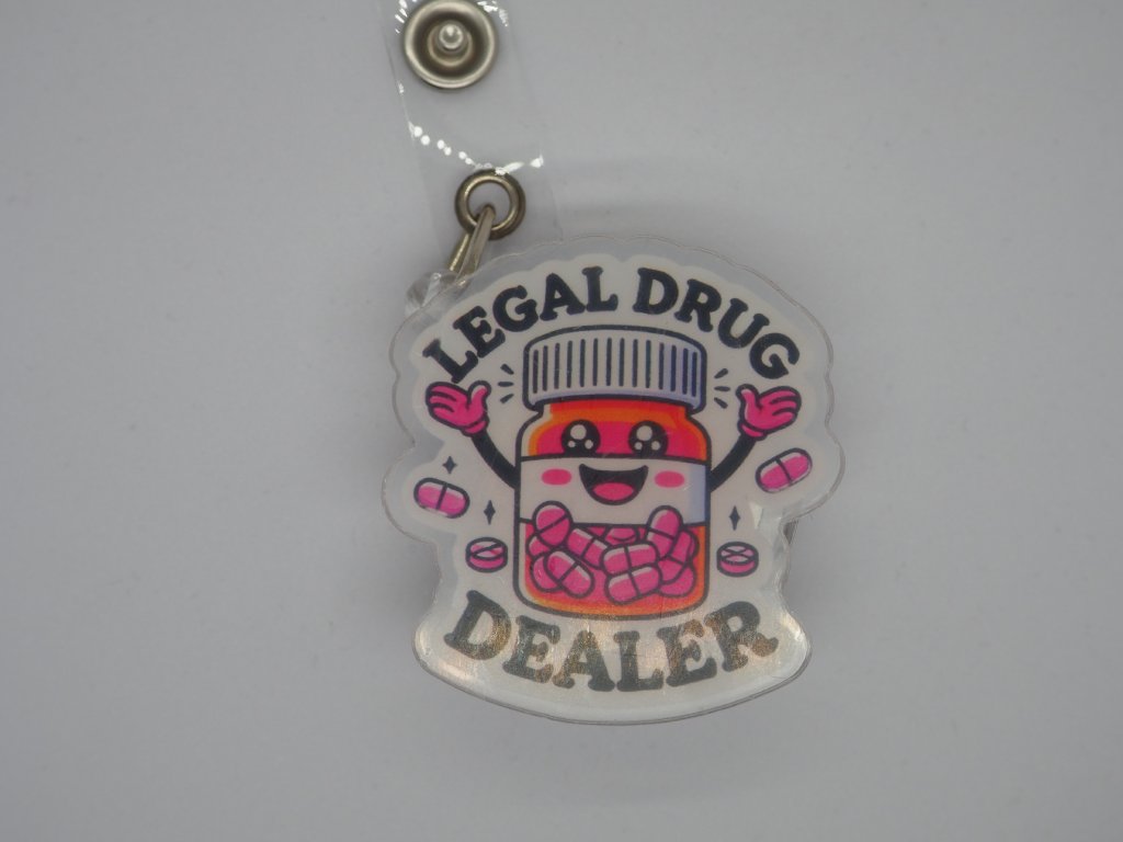 💊😄 Oživte svůj pracovní outfit touto originální ID visačkou ve tvaru lékovky s nápisem „Legal Drug Dealer“!