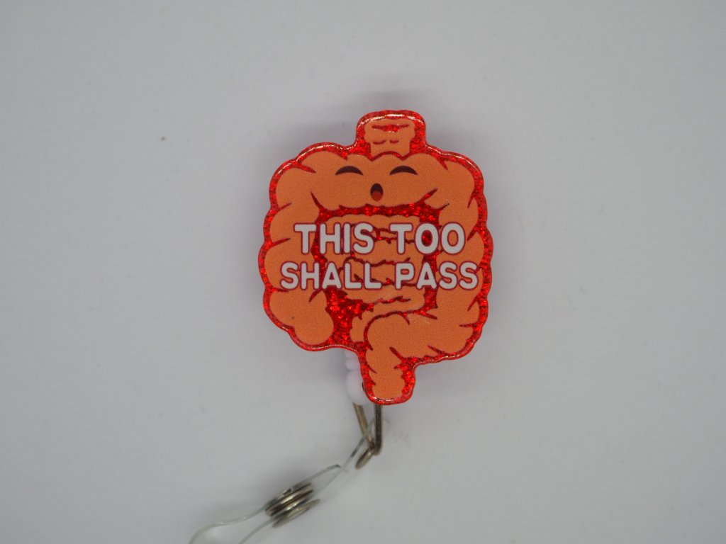 🌟🩺 Oživte svůj pracovní outfit touto originální ID visačkou ve tvaru střeva s nápisem „This too shall pass“!