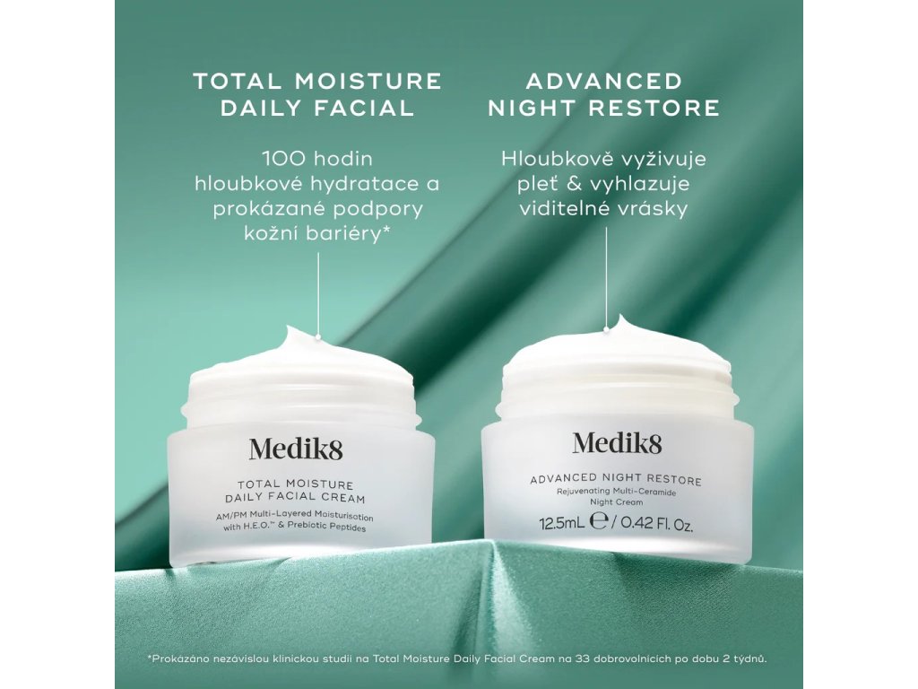 Dopřejte své pleti intenzivní dávku hydratace s tímto pečujícím duem. Přes den krém Total Moisture Daily Facial Cream klinicky prokazatelně zlepšuje stav pokožky už po 1 hodině¹, zanechává ji jemnou, hladkou a posílenou proti každodenním vnějším vlivům. Na noc krém Advanced Night Restore hloubkově regeneruje a vyživuje, aby se vaše pleť ráno probudila vypnutá, svěží a odpočatá.