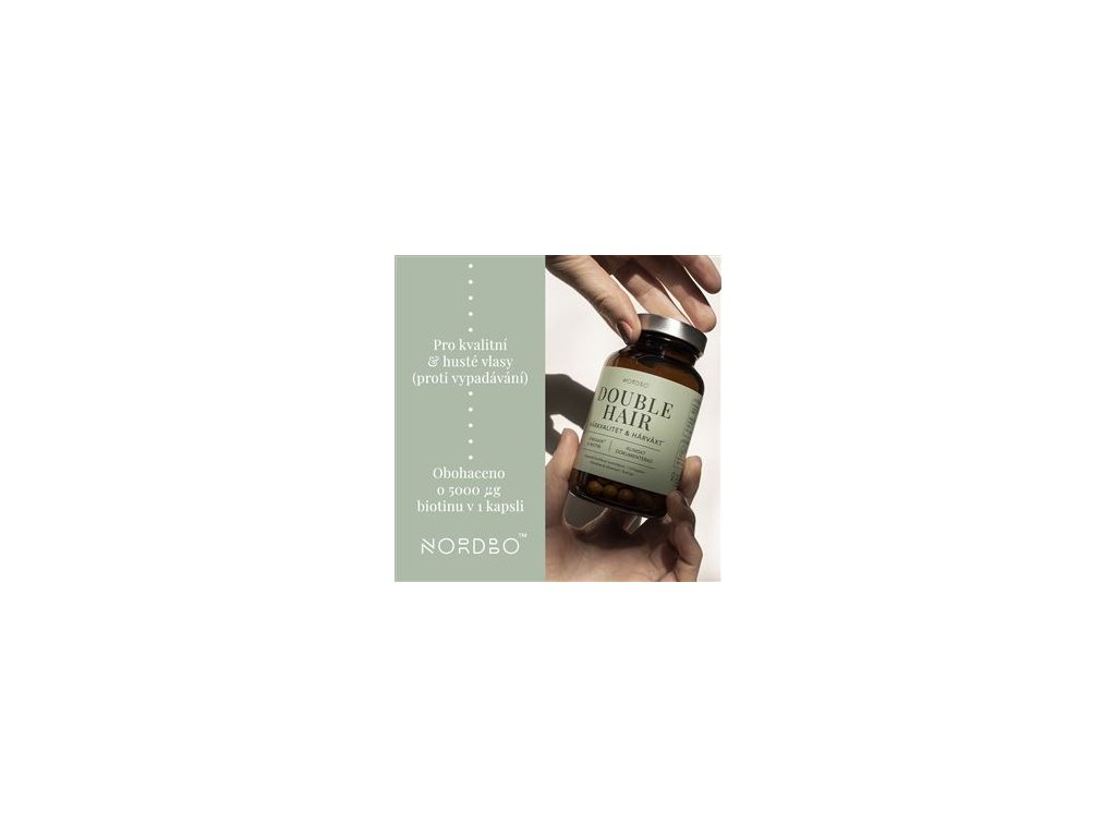 Nordbo Double Hair je velmi precizně zacílený doplněk stravy kombinují patentovaný extrakt AnaGainTM z BIO hrachových klíčků s vysokou dávkou biotinu. Vlastnosti těchto dvou složek jsou synergní a souvisejí se stimulací vlasových folikul, redukcí ztráty vlasů a jejich kondicí. AnaGainTM je speciální extrakt z hrachový klíčků, které jsou bohaté na složky aktivující buňky ve vlasových folikulech. Obnovují v nich mikrocirkulaci živin. Vlastnosti biotinu souvisejí s produkcí keratinu, který zvyšuje kvalitu vlasů. AnaGainTM byl testován v klinické studii s jedinci trpícími středně závažným vypadáváním. Po dvou měsících se snížila ztráta vlasů o 37 % a došlo k viditelnému zpevnění vlasových vláken.