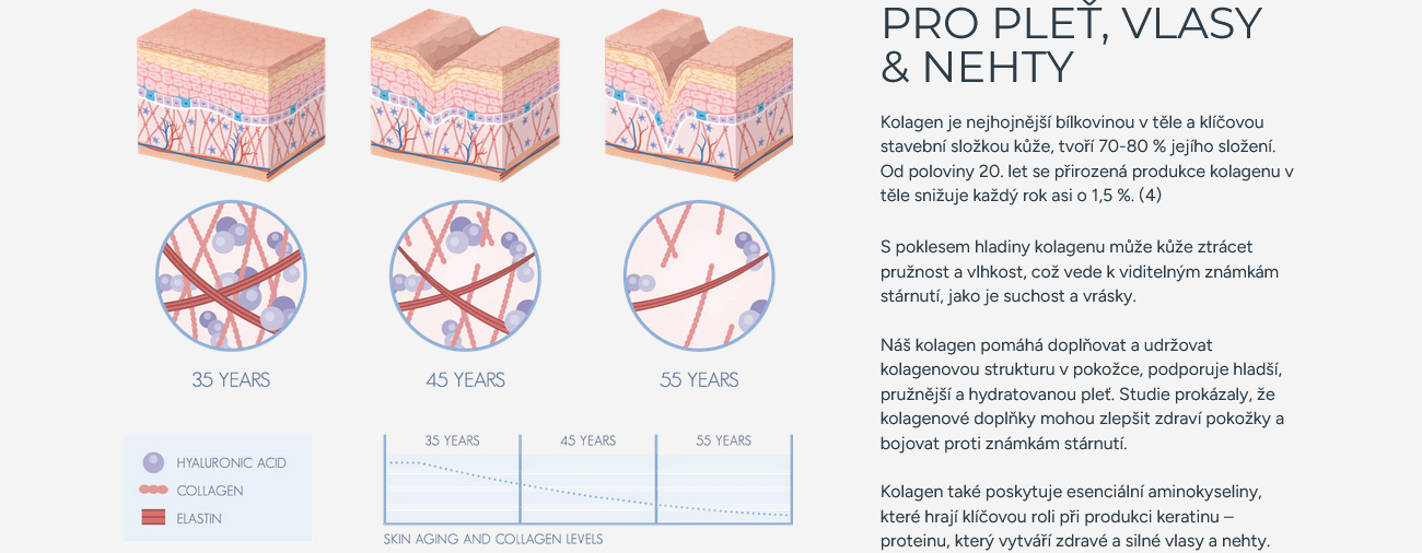 Po 25. roce života začíná přirozená produkce kolagenu klesat a hormonální změny tento proces dále urychlují. S věkem se schopnost těla obnovovat kolagen snižuje každý rok přibližně o 2 %.