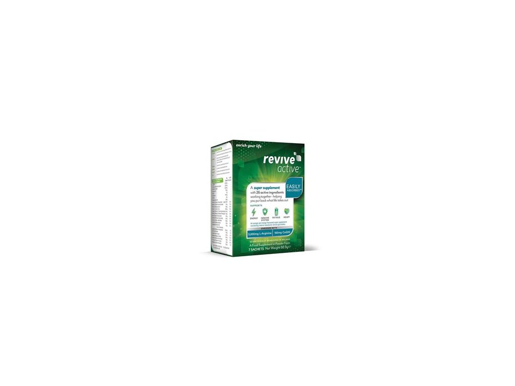 Revive Active není další multivitamín, jde o superdoplněk s množstvím účinných látek, které je pro multivitamíny zcela netypické. Revive Active se od jiných produktů odlišuje unikátní a velmi silnou kombinací vitamínů, minerálů a aminokyselin kombinovaných s dalšími složkami jako je koenzym Q10, L-arginin a citrulin. Prášek je snadno rozmíchatelný ve vodě nebo libovolném nápoji. Jeden sáček dodá potřebné mikronutrienty pro celý den. Doplněk je vhodný pro vegany, je kompletně bez lepku a je slazený steviol-glykosidy.