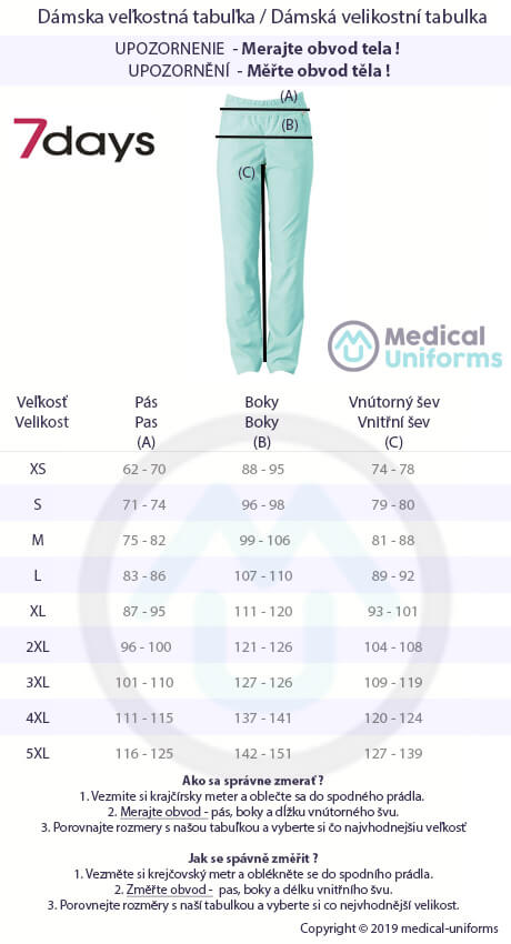Tyto pohodlné zdravotnické kalhoty značky 7days s elastickým pasem se stanou oblíbenou součástí vašeho pracovního oblečení. Vyrobeny jsou z kvalitní bavlny s 50% příměsí polyesteru, což zaručuje pohodlí a odolnost materiálu. Kalhoty mají dvě praktické boční kapsy a oblíbený úzký střih, který se hodí pro každodenní nošení.