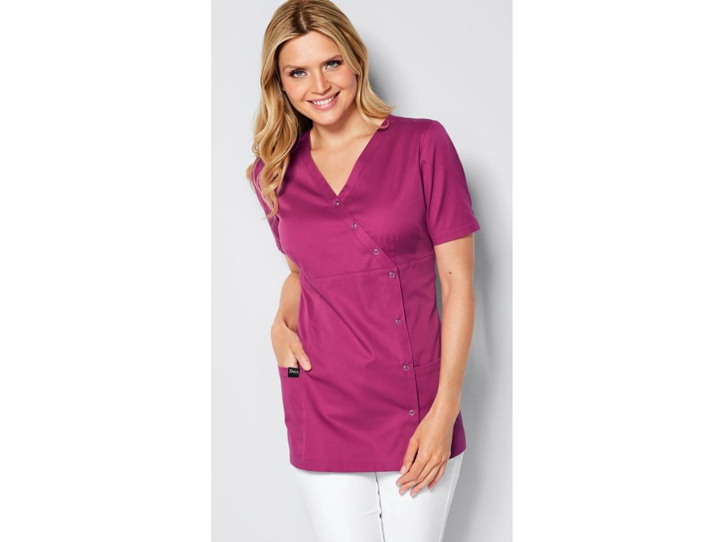 Dodání 4-5 pracovních dnů. Dámská tunika s krátkým rukávem, dvěma předními kapsami a cvočky na rychlé zapínání.Zaujme především čistým a zajímavě řešeným designem. V nabídce svěží zářivé i pastelové barvy. Materiál je lehký a příjemný. Halenu můžete prát i na 95° a je vhodná dokonce i do sušičky.