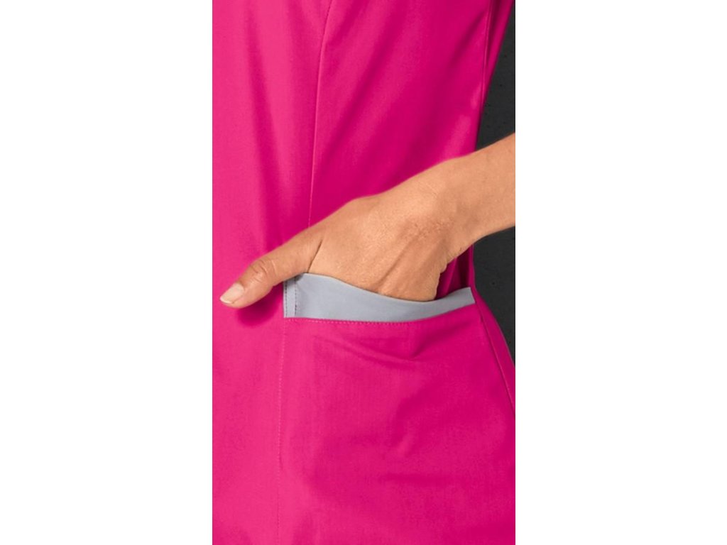 - Design: Šaty mají krátké rukávy, míře zaoblený lem a kontrastní označení „V“ výstřihu a předních kapes pro moderní vzhled.
